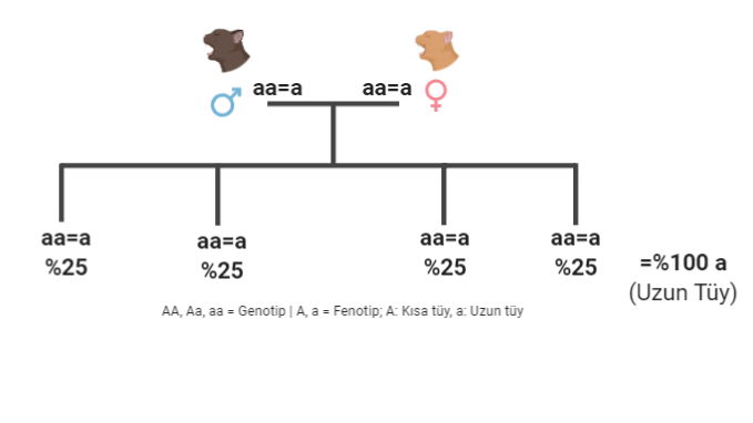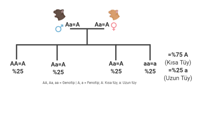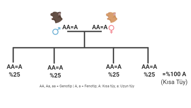İhtimal 1: Annenin genetik kodu “AA”, babanın genetik kodu “AA” ise hem anneden hem de babadan yavruya “A” kodu geçeceğinden yavrunun genotipi “AA” şeklinde olacaktır ve fenotipi de mecburen “A” şeklinde olacaktır. Yani tüm yavrular kısa tüylü olacaktır.